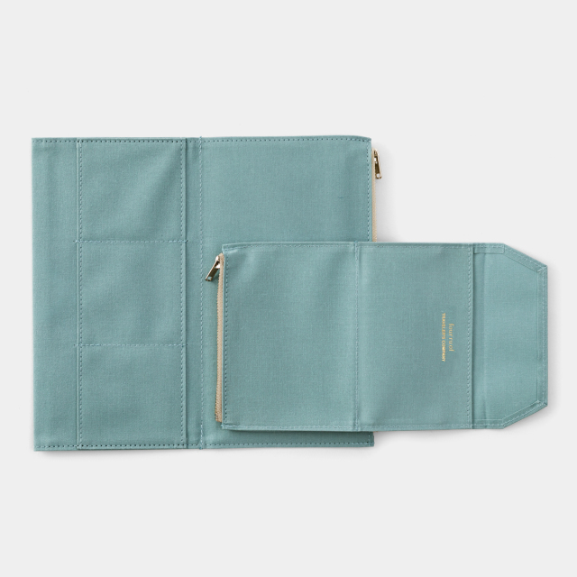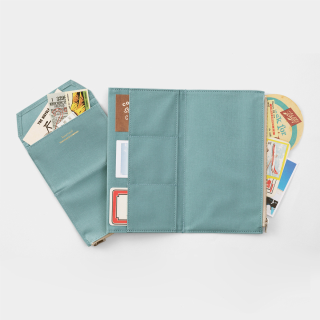 片側はファスナー付ケース、もう片方はチケットやポストカードの収納に便利なエンベロップ型のケースと名刺やカードが入るポケットが付いています。