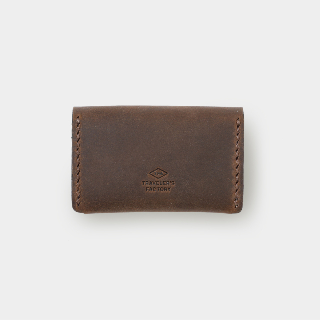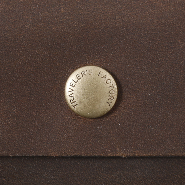 カードの出し入れがスムースにできるように、サイドに膨らみを持たせた形状になっています。また、縫製はハンドステッチで一針ずつ丁寧に縫い上げ、スナップは無垢の真鍮にTRAVELER'S FACTORYの刻印を入れたオリジナルパーツを使用。革とともに使うほどに味わい深く変化していきます。