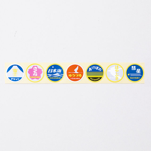 箱の中には、「富士」「さくら」「日本海」「ゆうづる」「あけぼの」「はやぶさ」「彗星」の7種類のシールがロール状に各10枚、合計70枚はいっていますので、ノートやカードのカスタマイズにはもちろん、ギフトや封筒の留めシールなどに気軽に使ってください。