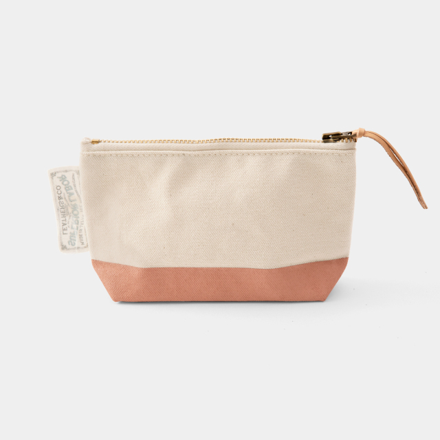 スタンプでロゴが押されている丈夫な生成りの帆布をベースに、底部にはペンキをペイントしデザインのアクセントとともに強度を出しています。トラベラーズノートのパスポートサイズが入るサイズです。横幅はブラス定規も入るので、ペンや文具をざくざく入れてペンケースとして使ったり、充電機やバッテリーなどを入れたり、化粧品やトラベル用のポーチなどにおすすめです。