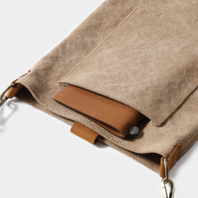 ショルダーベルトは、トラベラーズノートの革を使用。使いほどに味わい深く変化していくのとあわせて、柔らかく体に馴染んでいきます。長さが調節可能なので、男女問わずお使いいただけます。