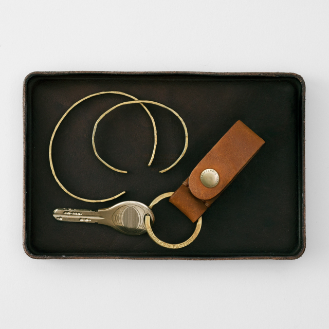 ナチュラルな質感の上質な国産の革、栃木レザーを型にはめ込み成型し、固め剤を塗布して作っています。その工程を工房でひとつずつ手作業で行なうことで独特の味のある質感が生まれています。切りっぱなしの革を縫製せず作ったトレイは、ブラスプロダクトとの相性もぴったりです。ステーショナリーや小物などの置き場にもおすすめです。