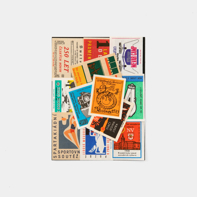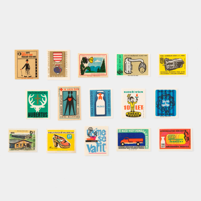 1940年~1960年頃のチェコのマッチラベルが15枚アソートでセットされています。広告、建物、子供、スポーツ、民族衣装、工業などさまざまなデザインが素朴で味のある紙と印刷方法で表現されている色とりどりの四角い紙は、眺めているだけで想像が膨らみます。ノートの表紙になどに貼ってのカスタマイズやコラージュの素材に。