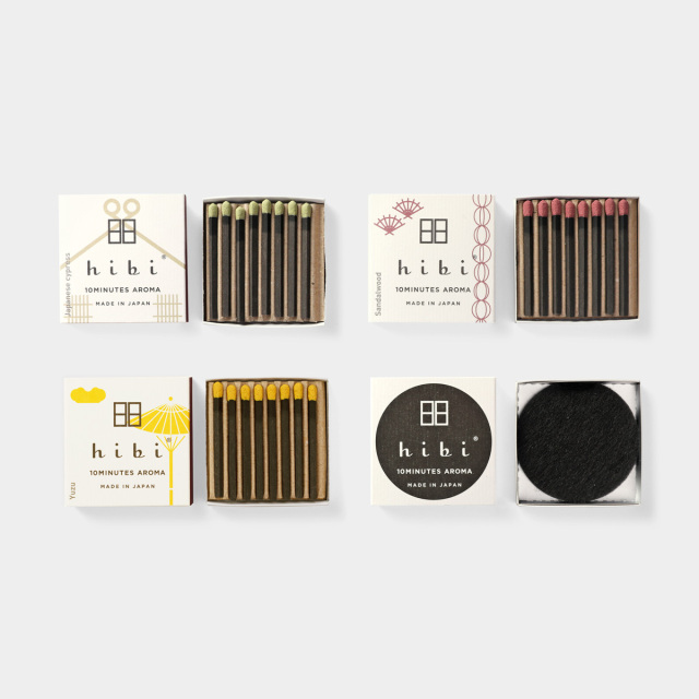 hibiは、淡路島のお香と播磨のマッチのコラボレーションで生まれた、着火具がなくても手軽に使えるお香スティックです。マッチを擦るように火をつけると、10分間心地よい香りが広がります。専用のマットが付属していますので、日々のちょっとしたひと時はもちろん、旅先のホテルの部屋などでも気軽にお香を楽しむことができます。