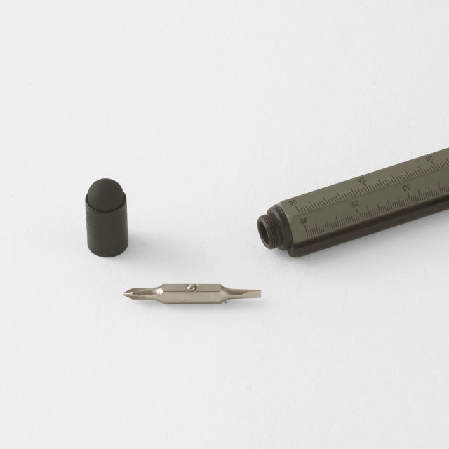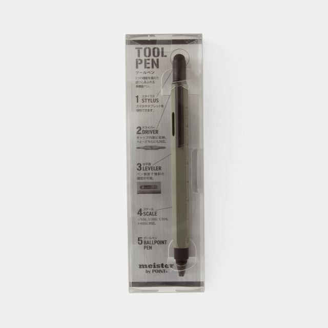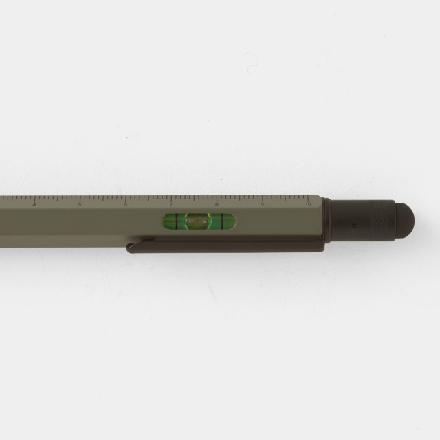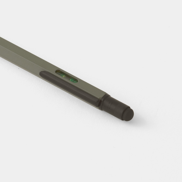 マイスター 多機能ツールペンは、インチとセンチのスケール、水平器、プラスとマイナスのドライバー、スタイラスペンとしても使えるスパイ道具のようなボールペンです。ボディーに記されたスケールに、ヘッド部分にはスマートフォンやタブレットに使えるスタイラスペンがつけられ、さらにそれを回して外すとドライバーが出てきます。ボディーに埋め込まれた水準器の精度も正確で、どの機能もきちんと実用に耐えるように作られています。