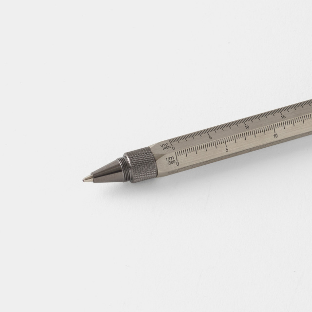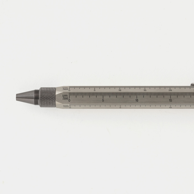 機能:スタイラス(スマホやタブレットを操作)、ドライバー(プラスとマイナス)、スケール(100分の1、200分の1、300分の1、400分の1)、水平器、ボールペン