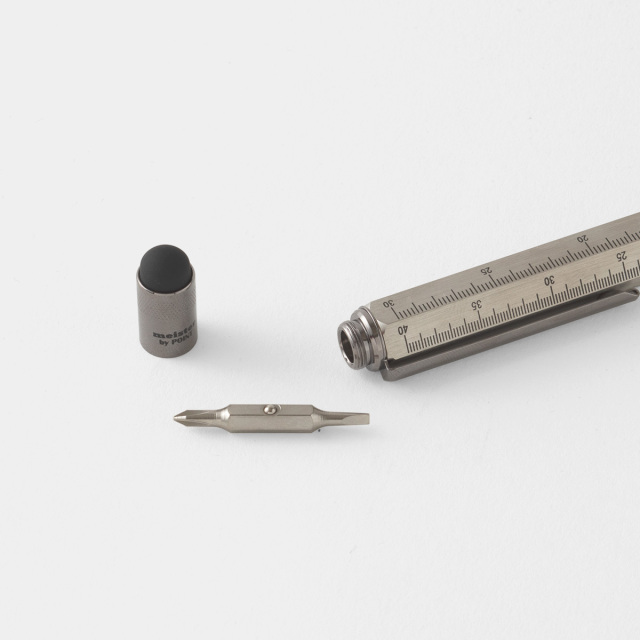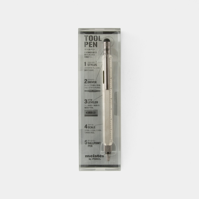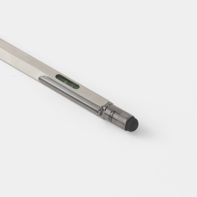 マイスター 多機能ツールペンは、インチとセンチのスケール、水平器、プラスとマイナスのドライバー、スタイラスペンとしても使えるスパイ道具のようなボールペンです。ボディーに記されたスケールに、ヘッド部分にはスマートフォンやタブレットに使えるスタイラスペンがつけられ、さらにそれを回して外すとドライバーが出てきます。ボディーに埋め込まれた水準器の精度も正確で、どの機能もきちんと実用に耐えるように作られています。