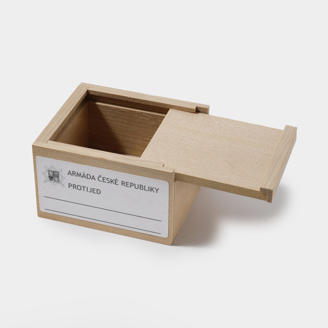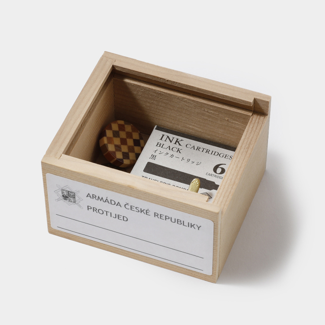 1990年代にチェコ軍用作られたデッドストックのスライド式木製小箱です。本来は薬を入れるための箱として作られましたが、クリップやチャーム、インクカートリッジにスタンプなどのステーショナリー小物の収納にぴったりです。チェコ共和国陸軍のマークに、見慣れないチェコ語がレイアウトされたラベルも味があります。