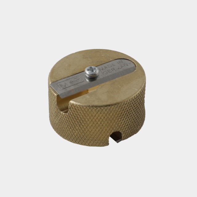 丸いボディーの片面には一般的な8mm程度までの鉛筆用、裏面には11mm程度までの太軸用の2種類の機能がひとつのボディーに収められています。無垢の真鍮製のため、使うほどに色が味わい深く変化していきます。外周部に施された滑り止めの加工や、手にした時の程よい重みなど、道具としての美しい佇まいが魅力です。