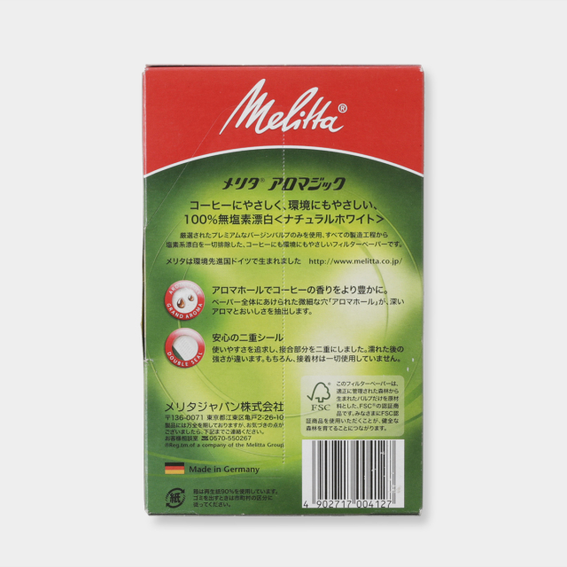 Melitta コーヒードリッパー(2~4杯)用のペーパーフィルターです。バージンパルプのみを使用し、FSC認証取得の環境にやさしいフィルターペーパーです。