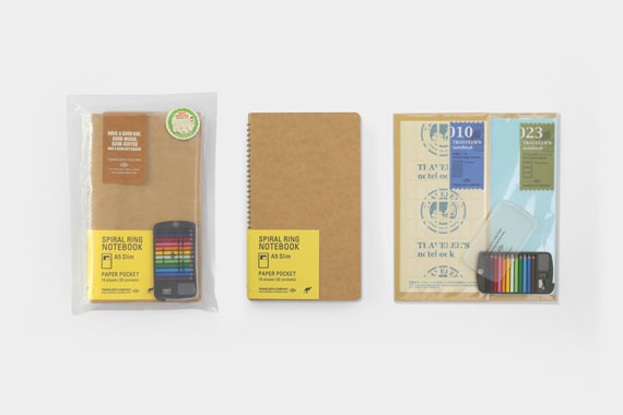 すべてのページが紙のポケットの「TRC スパイラルリングノート<A5スリム> ペーパーポケット」に、ノートのカスタマイズに便利な両面シール、カードポケットシール、ミニカラーペンシルをまとめてギフトセットにしました。