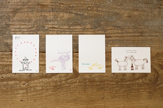 1917年創業の画材店、月光荘のカードです。思わずにやりとしてしまうゆるいタッチのイラストに、それぞれ「感謝のお手玉 胸いっぱい」「アパートのドアをたたく前には花束を」「See you soon!」「いつもありがとうございます。またウマい酒をご一緒に。」と言葉がプリントされています。ギフトに添えてお母さんに。